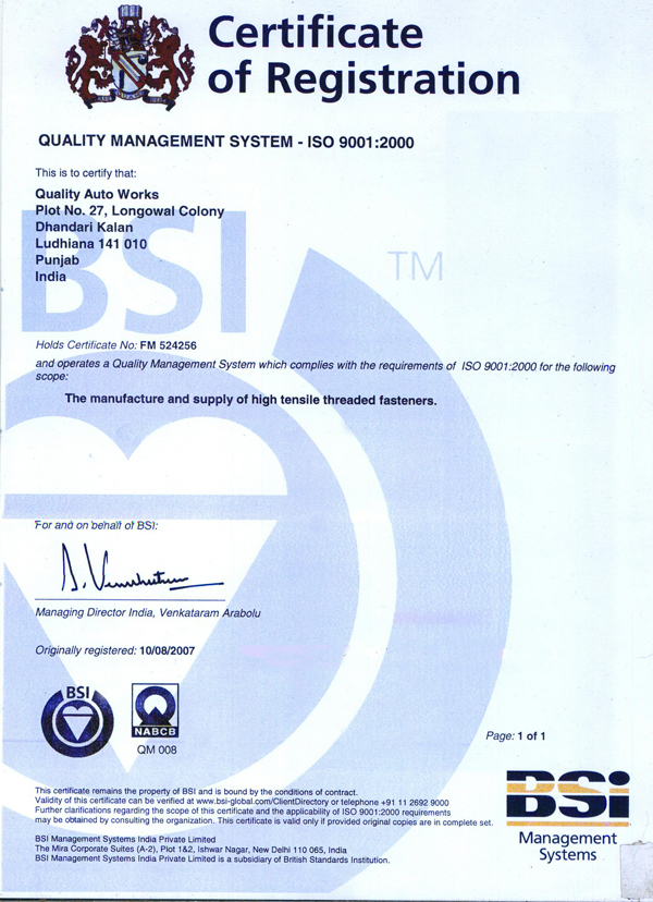 Quality Auto Works Fasteners are manufactured under a strict Quality Control Program – Raw material Inspection, In-process Inspection, on-line Inspection of finished products with a modern Quality Assurance Lab – a fool-proof system of checks and controls at every step with value added services that ensures compliance to product specifications and performance criteria.